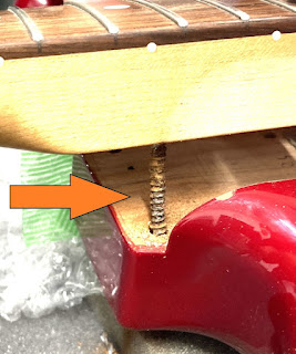 By utilizing the secret technique of the Middle Nejisaurus Mogura DBZ-410 (So-called Middle Socket Screw Extractor) and the skills of the Rescue Team, we successfully removed the screw and disassembled the neck of the guitar.