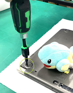 The laptop PC was promptly sent to us, and the Screw Rescue Team initiated the operation. Using the Nejisaurus Bazooka DBZ-57 (So called Rapid Screw Extractor), we extracted these two screws very easily.